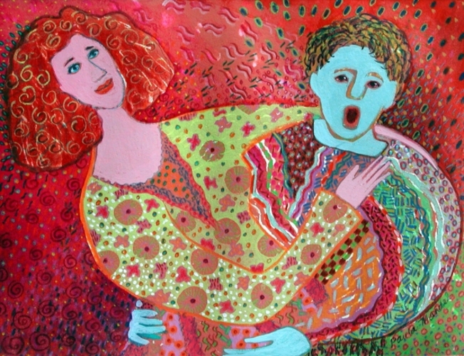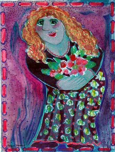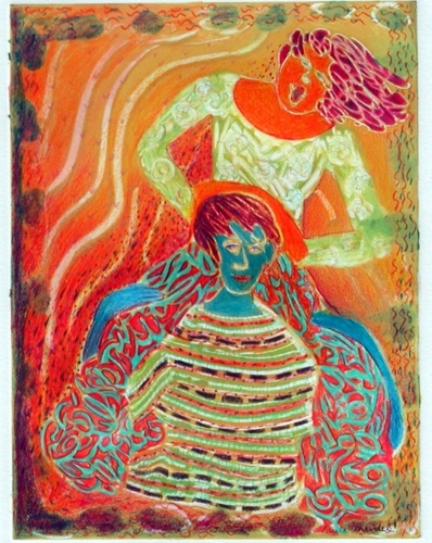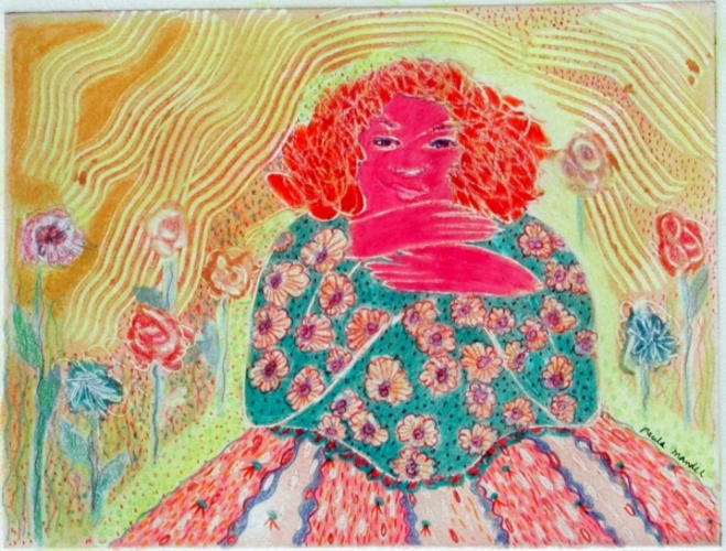 Whimsical images often begin as a monoprint. As I add Prismacolor, I create a humorous, soft, decorative energetic surface.